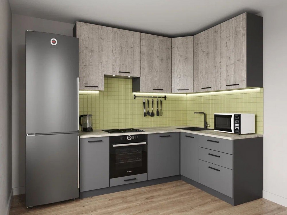 Кухонный гарнитур Антик 2200*1600 h950 (Стол. 26мм) Верх Корпус: Антрацит Верх Фасад: Ель Антик (№3871) МДФ Низ Корпус: Антрацит Низ Фасад: Берлин (№962) МДФ Столешница: Сосна Осло Описание: Корпус ЛДСП 16 мм, кромка ПВХ 0,4 мм. Фасады ЛДСП 16 мм, кромка ПВХ 1мм. Фасады МДФ 16 мм Фасады верхних модулей со свесом 12 мм дают возможность использовать без установки ручек. Петли с доводчиком. Навесы внутренние, регулируемые, с декоративной крышкой. Направляющие шариковые полного, плавного выдвижения с нагрузкой до 30 кг. Столешницы цельные с пластиковым покрытием со скруглением по переднему краю (постформинг толщина 26 мм). Регулируемые ножки-опоры.